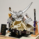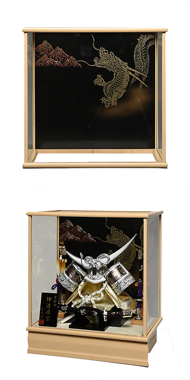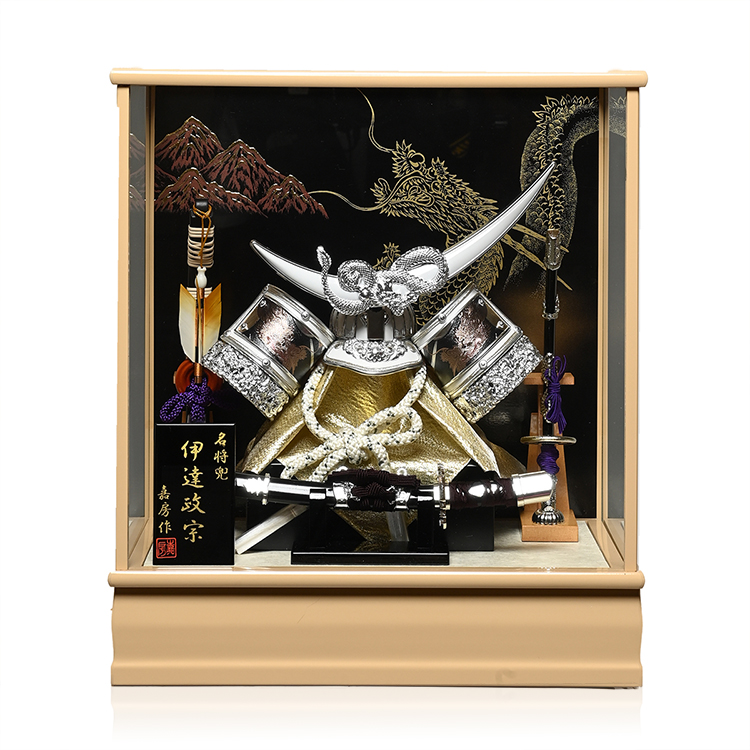 『伊達政宗公白銀兜』トレンディな背景昇竜象牙色ケース に、白銀伊達政宗公兜をセットしたお薦めの一品です。