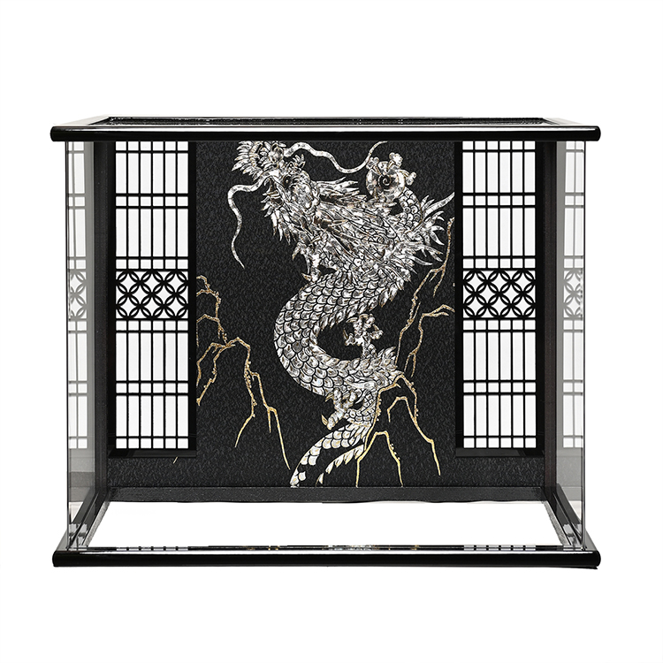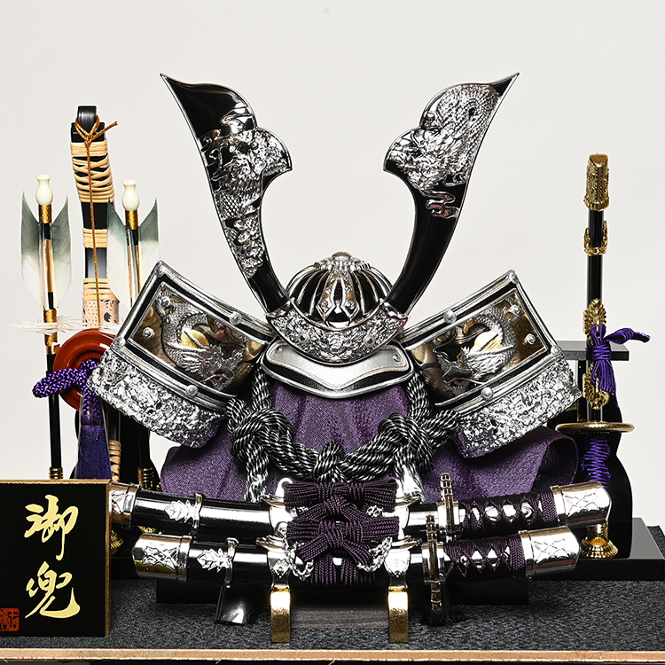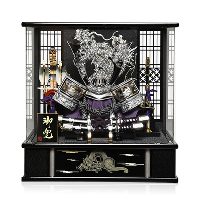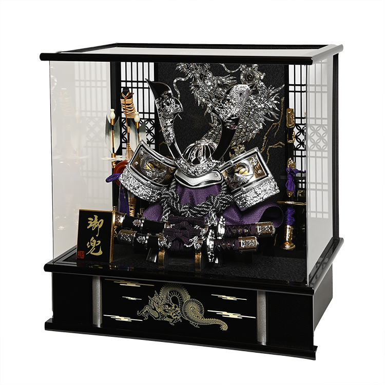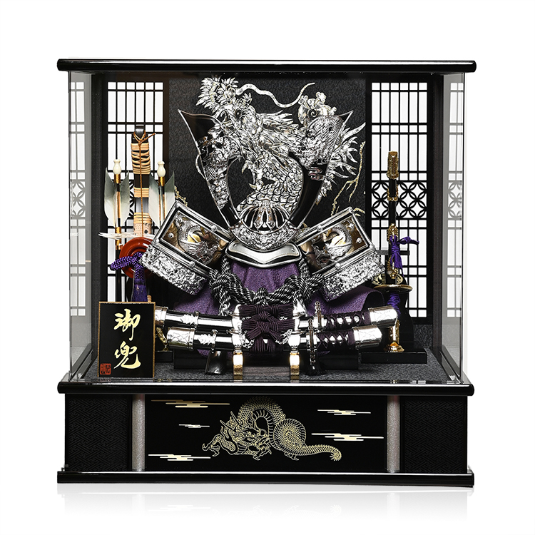 『大鍬型昇龍シルバー兜』を、漆黒塗アクリルパノラマケースにセットして、トレンディな兜ケース に仕上げました。
