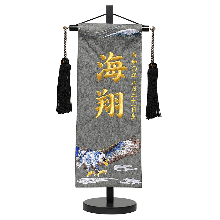 日本の伝統色山鳩色に鷹(鷹が空を飛揚するように、何物も恐れず悠然と)裂地に、お名前(金色糸で書き順通り)と生年月日を漢字でお入れ致します。兜・鎧等コンパクトサイズ五月人形飾りの隣にまた、お部屋を彩るインテリアとしても活躍してくれます☆