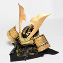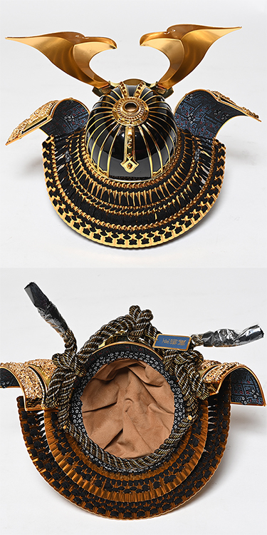 人形の伏見屋 > 五月人形 > コンパクト収納 > 25号ハヤブサ型ゴールド牡丹金物吹返兜・ゴールドメタリック屏風・高台飾:高輝作作