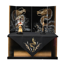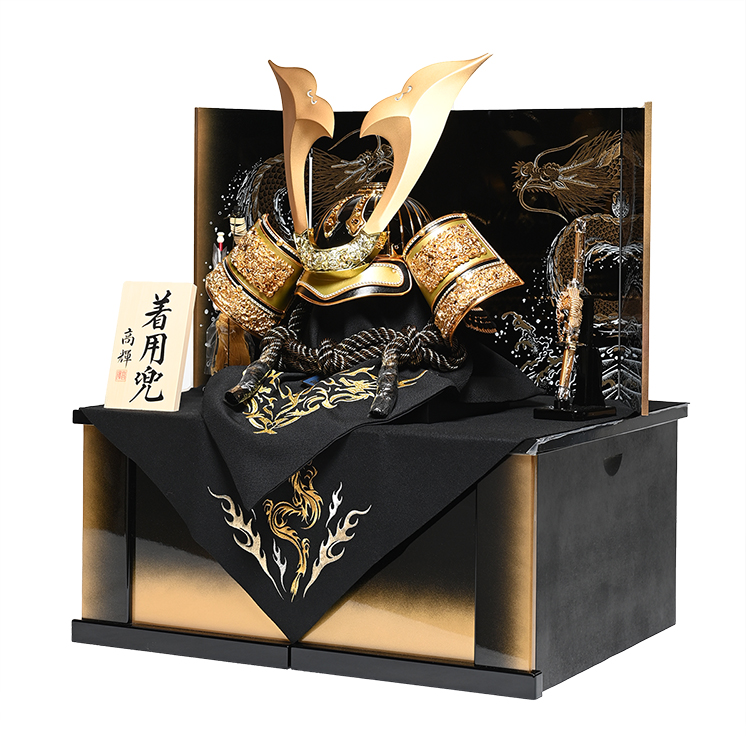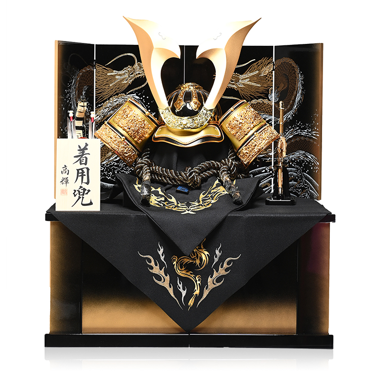 『25号ゴールドハヤブサ型兜』を、ゴールドメタリック蒼龍 (四神獣)蒔絵屏風・高床台にセットした勇壮感溢れる着用兜飾りに仕上げました。