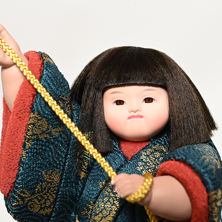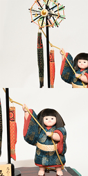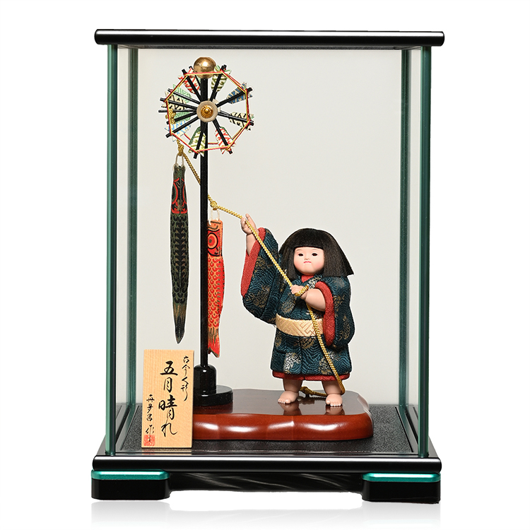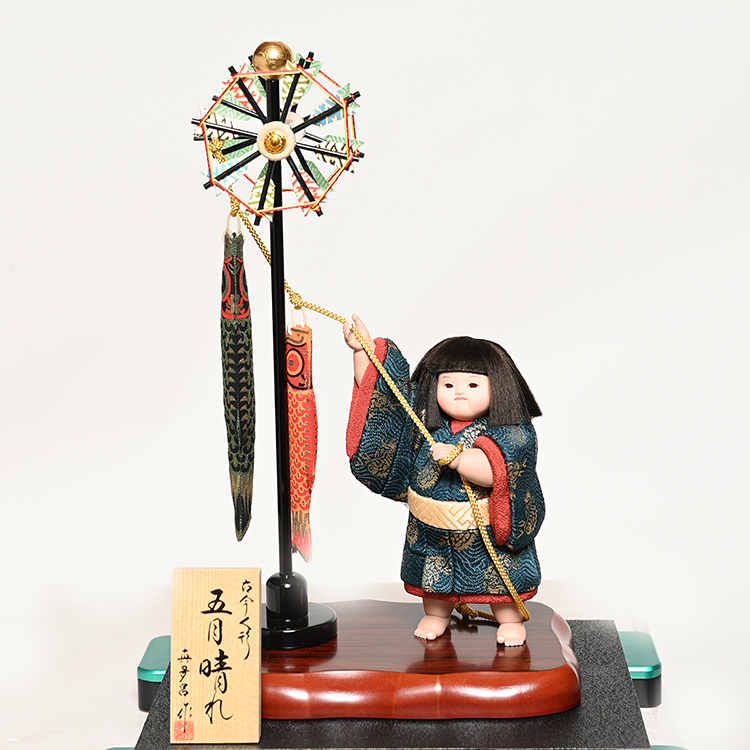 『五月晴鯉のぼり』五月晴の中男の子が鯉のぼりを引き上げる様を、木目込み男の子とチリメン鯉のぼりでで再現した、端午の節句鯉のぼり引き上げ人形です。