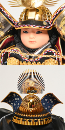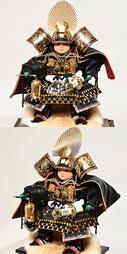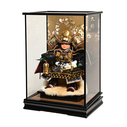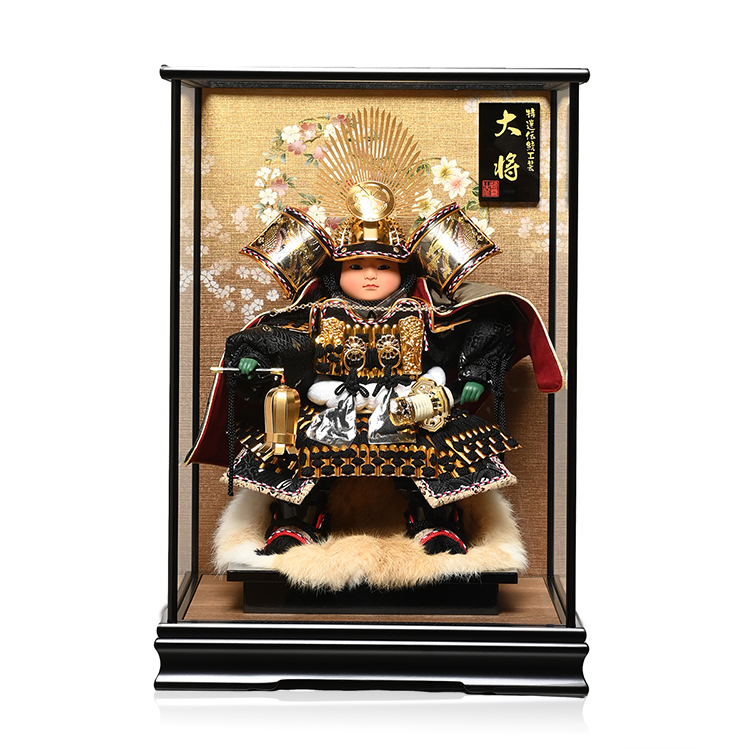 『織田信長童大将ケース』戦国時代に、天下を統一へ導いた、三英傑・織田信長・徳川家康・豊臣秀吉・公の幼少期姿を鎧着にマントと勇壮な姿で再現し、漆黒塗ケースにセットしたアーバンスタイル童ケース飾り。