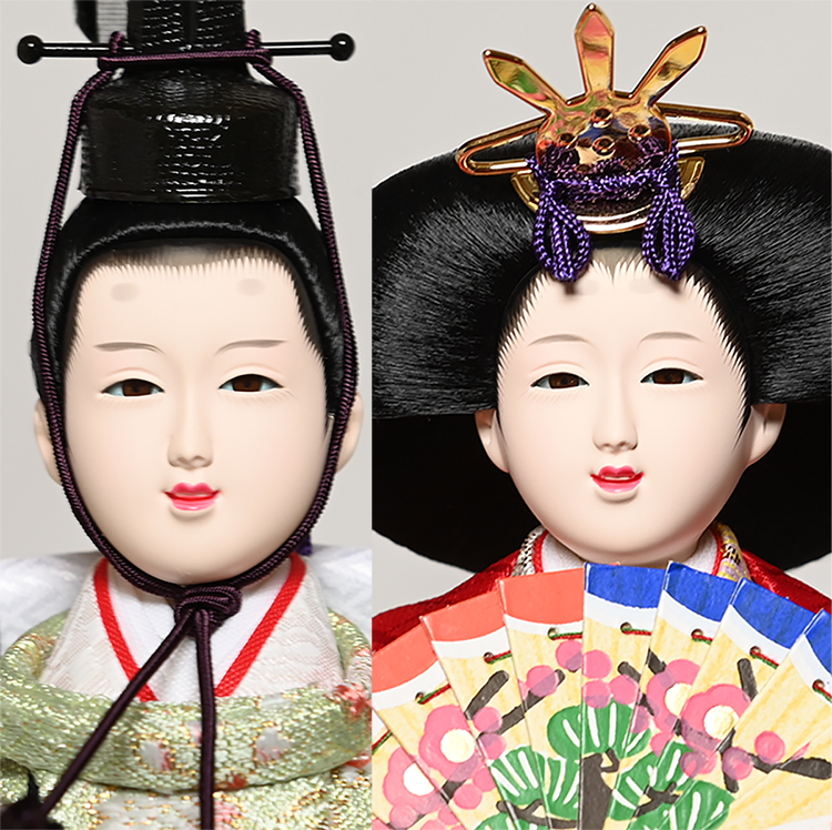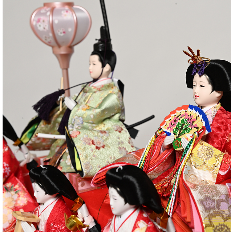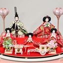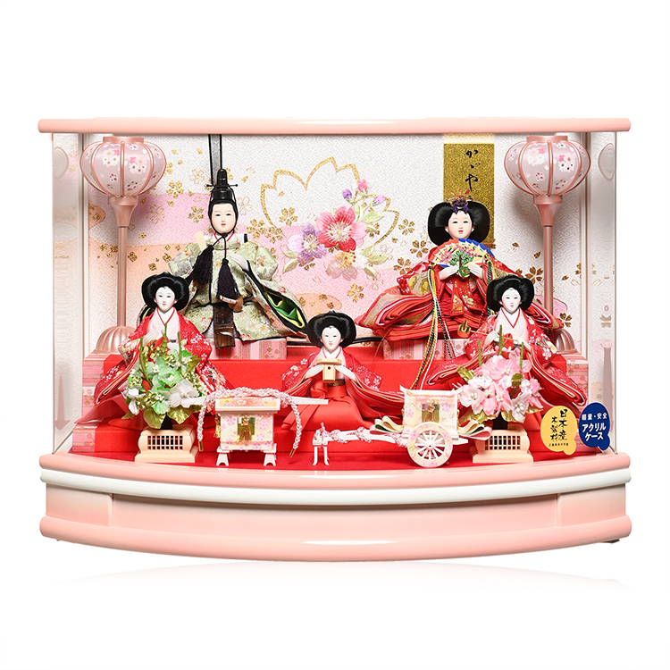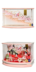 『サーモンピンク&アイボリーホワイト曲面パノラマケース』に春めいた色彩の親王様・桜柄衣装の三人官女をセットして、アーバンスタイル な中にも品格漂う雛ケースに仕上げました。