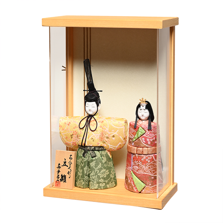 『木製アクリルシエルピンクケース』立雛は雛人形の原点とされ、独特な立ち姿が特徴です。シックな立雛を木製アクリルムースにセットして、リーズナブル価格でお届け致します。