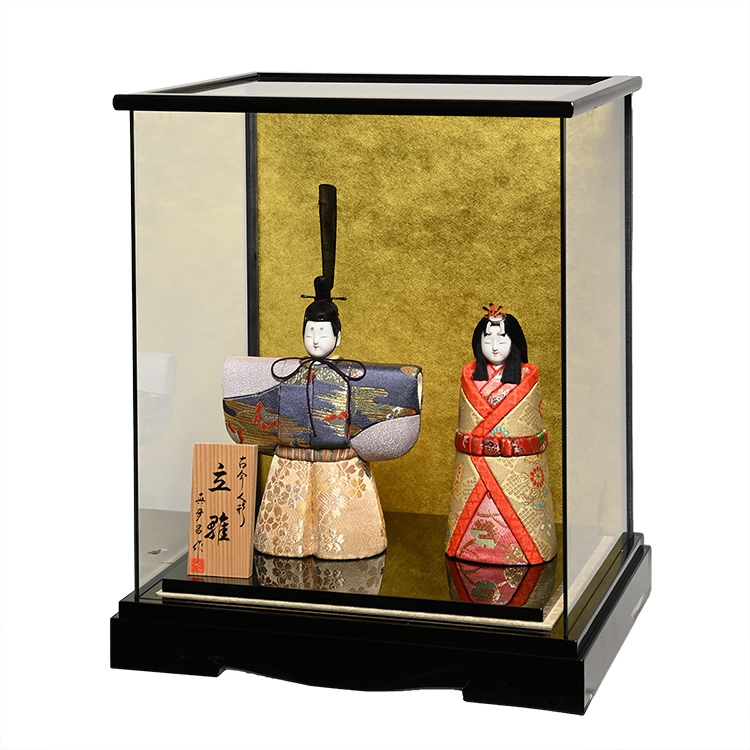 『漆黒塗パノラマケース』に、雛人形の原点とされる立雛、歴史の重みを感じさせる格式高くシンプルでお洒落なお雛様をセットした、コストパフォーマンスが高い雛ケースです。