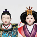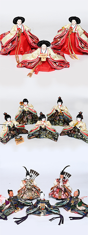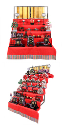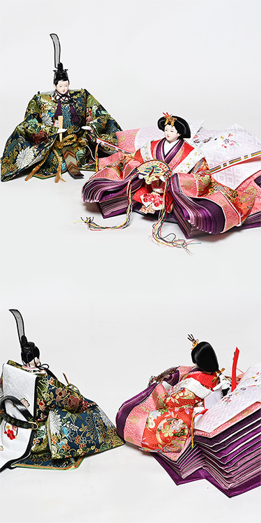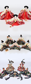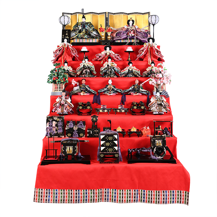 金箔・銀箔砂子屏風に西陣織お衣裳の親王様、お姫さまは職人仕立ての本式十二単衣、三人官女・五人囃子は金糸をふんだんに使った伝統柄で艶やかな気品漂う仕上がりです。お道具も全て梅柄木製品と、細部に到るまで手造りの温かさが伝わる、伝統的緋毛氈七段飾り。