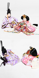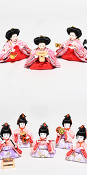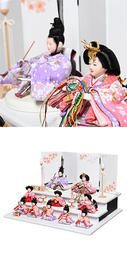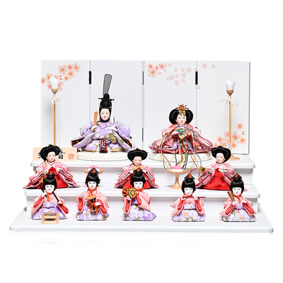 花筏(はないかだ)蒔絵白木製屏風・白木三段にセットしました、飾る楽しみいっぱい今風の(間口42.5×奥行36×高さ27㎝)コンパクト10人飾り決定版。