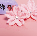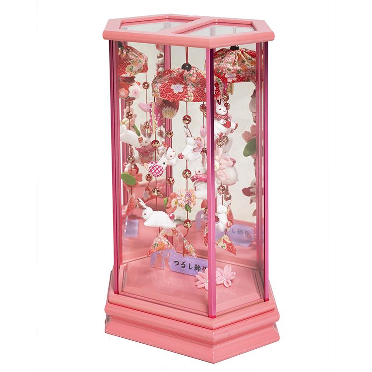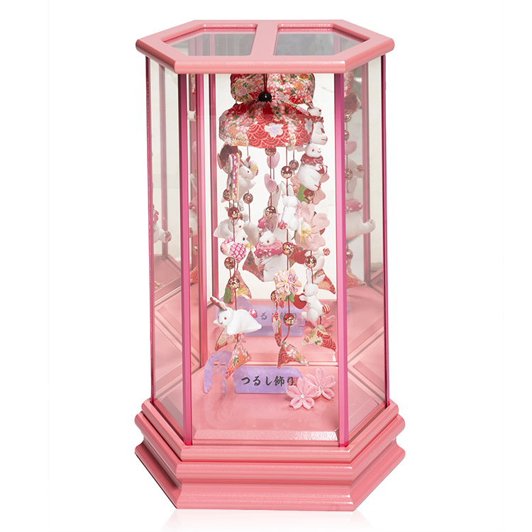 パールピンク鏡バック六角ケースに、縮緬裂地桜、周り五連に可愛い兎