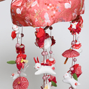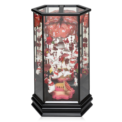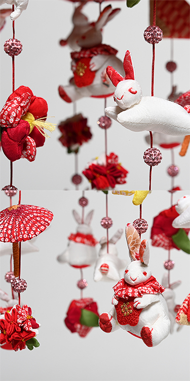 『赤傘に五連兎つるし飾』六角漆黒塗り背面三方鏡ケースに、色んな動作の可愛いうさぎを、傘や花・扇子の縁起物とお洒落に吊るしました。