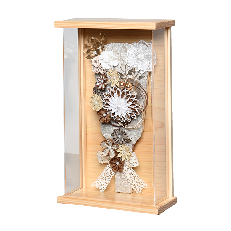 のシックなアクリルケースにセットして壁掛け・置型のtwo wayスタイル羽子板ケースに仕上げました。